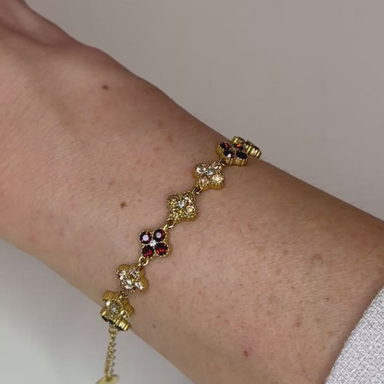 Caratterizzato da una catena dorata impreziosita da fiori in cristalli multicolor - rossi, bianchi e bordeaux - questo bracciale dona un tocco di raffinatezza a ogni look.