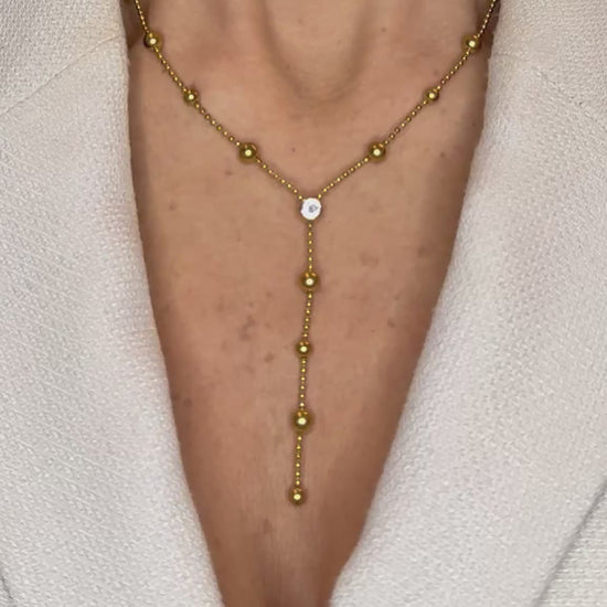 La Collana Divine è un'opera di eleganza senza tempo che unisce l'ispirazione del rosario classico al design lariat moderno, con cristallo centrale luminoso e pendente a Y che cattura la luce con grazia divina.